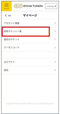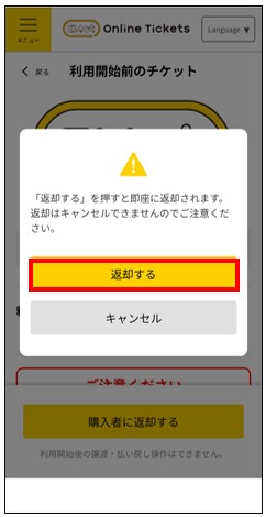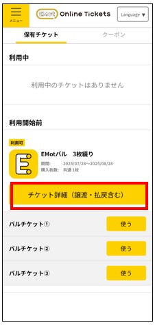 保有チケット一覧から返却したいチケットを選択し「チケット詳細」をタップ。