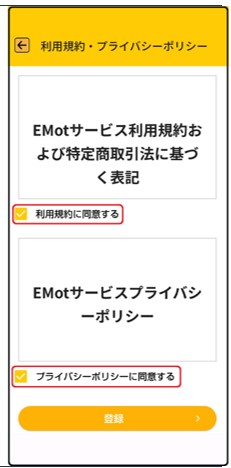 利用規約・プライバシーポリシーをご確認の上同意するにチェックを入れて登録をタップ。