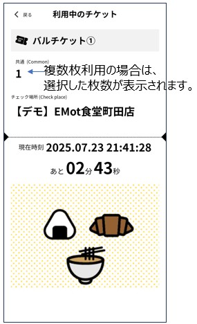 カウントダウン終了までにチケット券面を店員へ提示しバルメニューの提供を受けてください。
