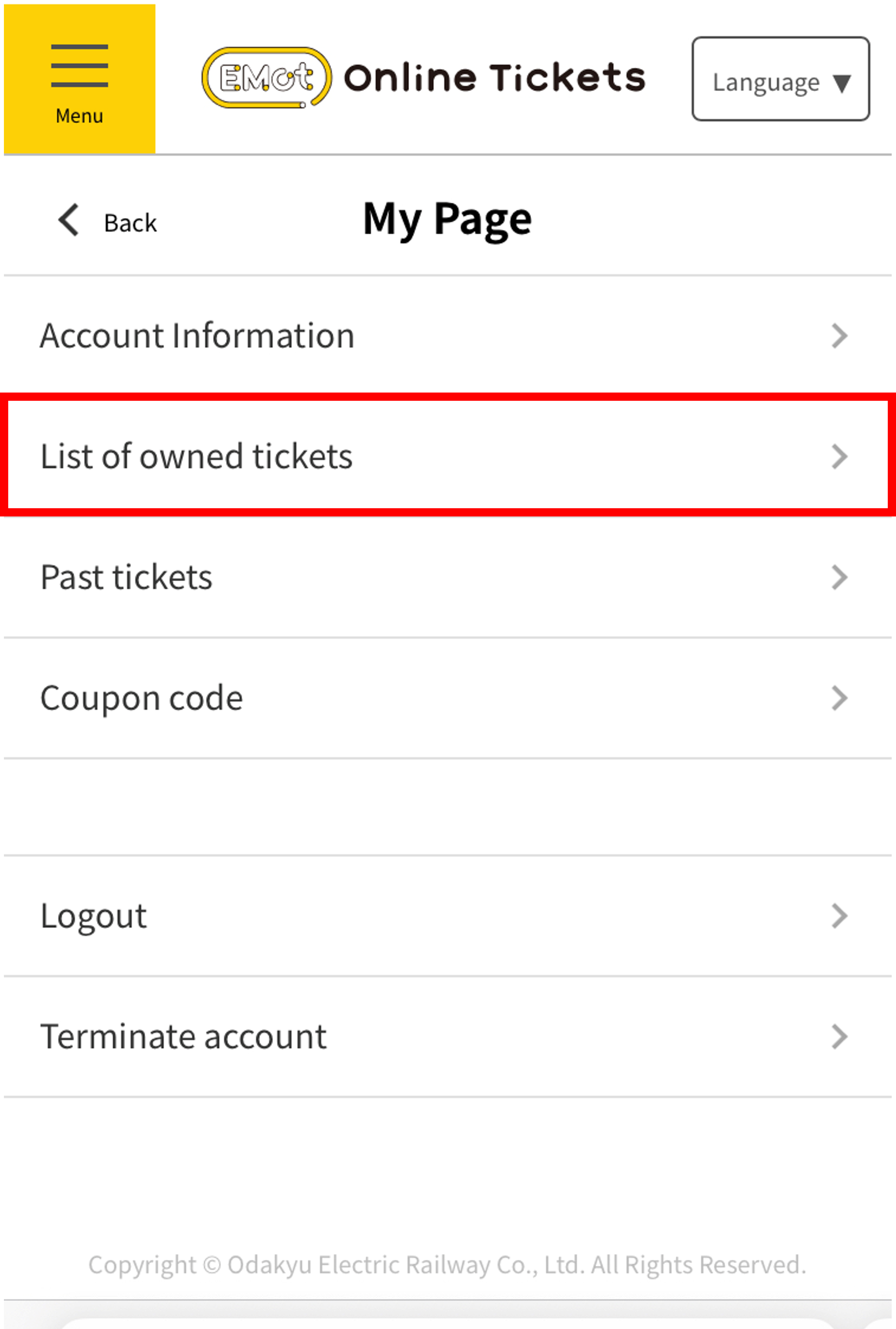 Access "EMot Online Tickets" and select "My Page" from the menu.