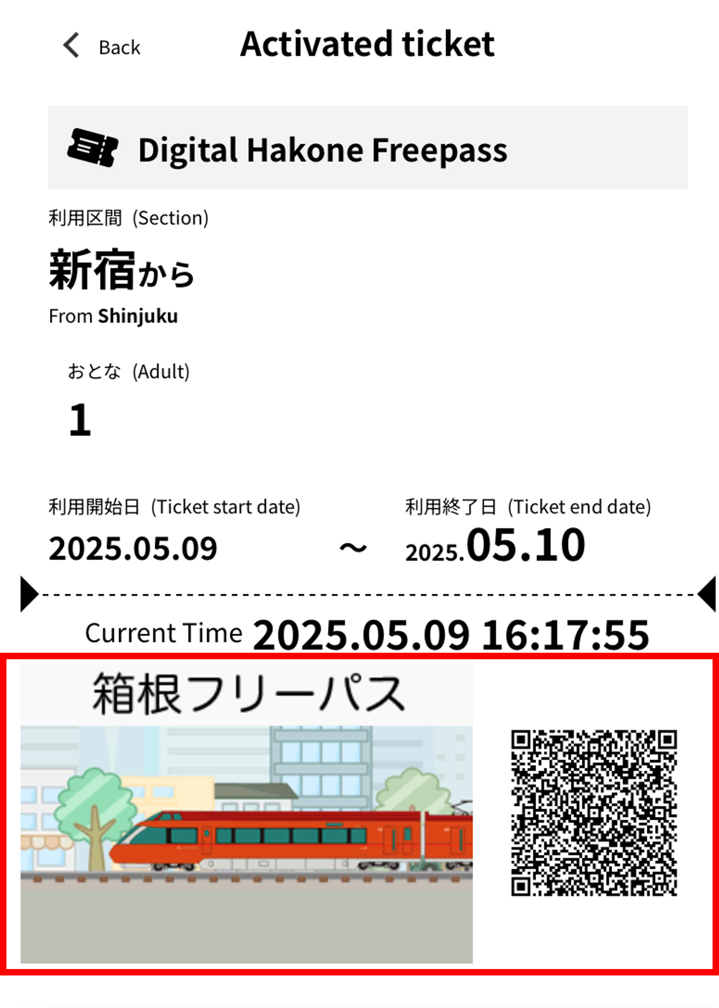 The ticket screen will be displayed. When using the ticket, either show the animation to the facility staff or scan it using a QR authentication terminal.