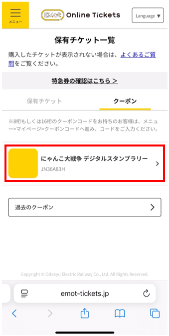 保有チケット一覧のクーポンページへ遷移するため、「にゃんこ大戦争 デジタルスタンプラリー」を選択する。