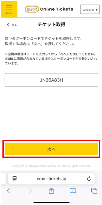 クーポンコードが入力された状態でチケット取得ページに遷移するため、「次へ」を押す。