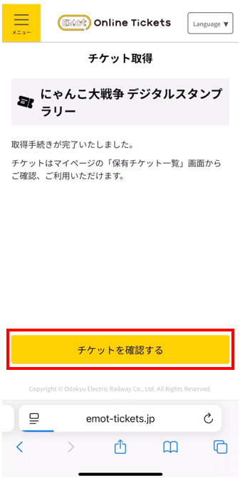 「にゃんこ大戦争 デジタルスタンプラリー」と上部に表示されることを確認し、「チケットを確認する」を押す。