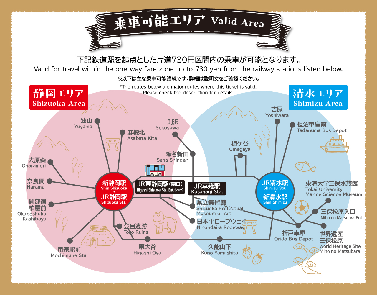 ※JR静岡駅・JR東静岡駅・JR草薙駅・JR清水駅を起点としたバス路線の片道730円区間エリア内停留所間の乗降が可能です。
