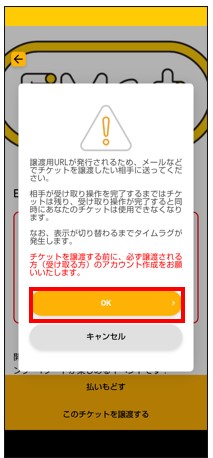譲渡したいチケットを表示させ赤枠をタップ。