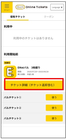 保有チケット一覧から返却したいチケットを選択し「チケット詳細」をタップ。